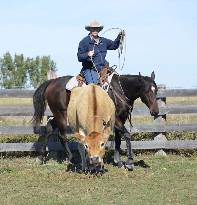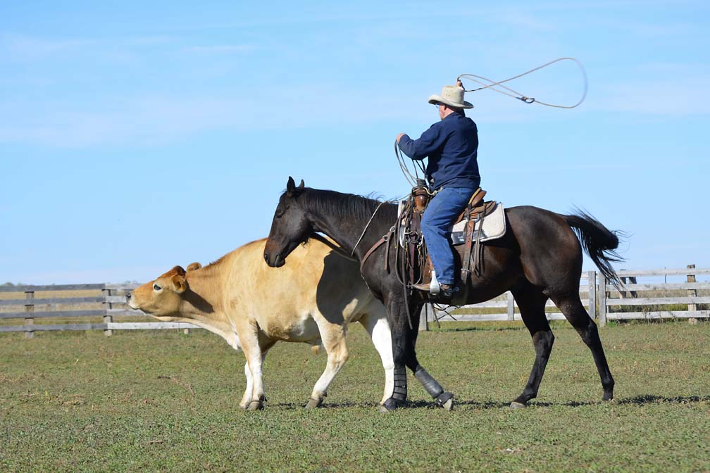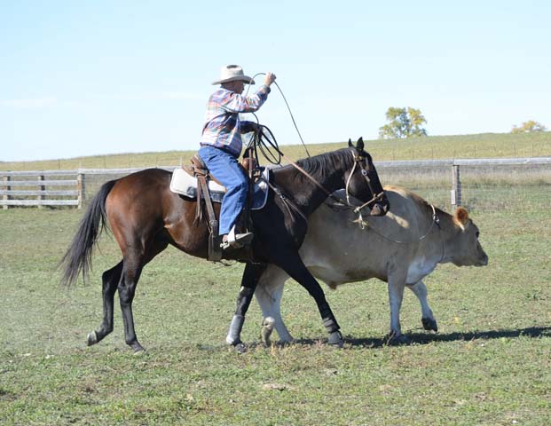 Quaint has drawn attention with his displays of bridleless roping and working of gates. But if you are more comfortable using a bridle, he will go in anything: snaffle, curb, or even a halter. We can visualize him as a wonderful hunting mount and he's shown an aptitude for fences when free-jumping. Hounds under-foot and whips cracking overhead shouldn't be a problem, if his easy acceptance of roping cattle is any indication. He has the tall, dark and handsome looks favored in the field or show ring.