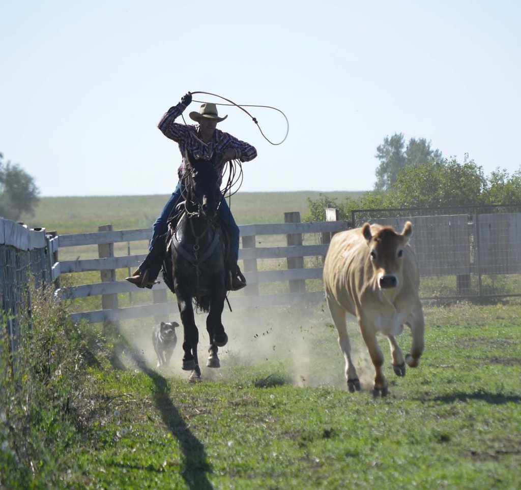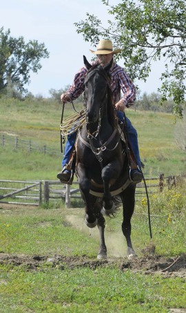 The only thing left to do was let Joe the Jersey into the arena and see what Cactus thought of the big steer. After perhaps 10 seconds of nerves (only seen by his chewing the bit), he marched right up to Joe and pushed him down the fence. It took maybe a minute more to realize how much fun cow chasing was and then he really dug down and made poor Joe run and turn, tracking him like a Border Collie. Dale couldn't help himself and took the rope out and roped Joe...not once, but 5 times!